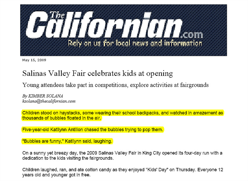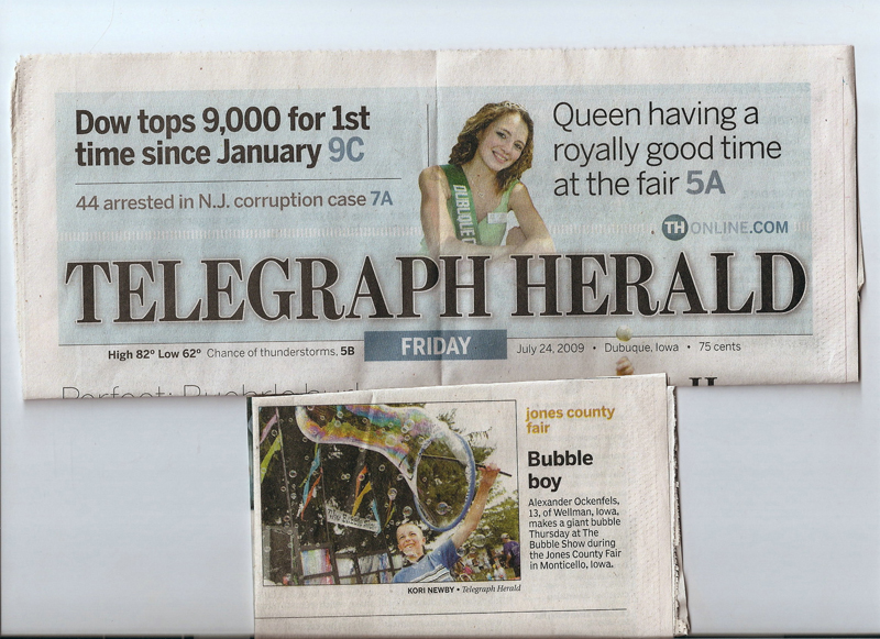 Newspapers love kids and bubbles! We have appeared in the media at every fair we’ve performed so far. Samples are included below.